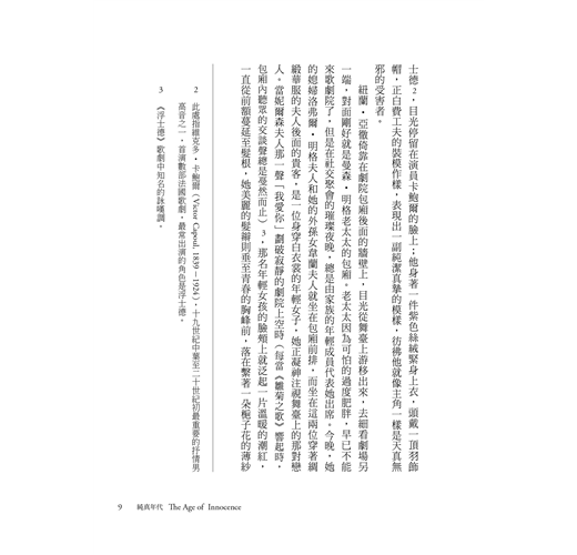 「《純真年代》是華頓公認的傑作,為她贏得1921年的普立茲小說獎,使她成為第一位獲此殊榮的美國女性作家。「變遷」是小說的重要主題,華頓回顧鍍金時代的紐約上流社會,批評中夾雜懷舊;而不同時代的文學品味與價值觀,也讓文本的解讀隨之變化。不變的是華頓優美的文字寫作、高超的小說技巧與難忘的人物刻畫,值得細品。」
