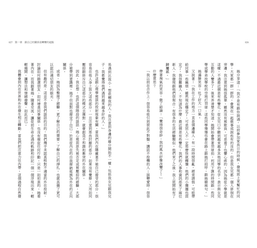我們隔週談話,將近八個月,一起翻閱生命中的故事,包括弟弟死於意外之後,她內心的歉疚和孤單;小學時候好幾次被欺負,不知道如何求援的害怕;婚姻的傷痛;多重障礙女兒帶來的心疼和喜悅,以及對兒子的抱歉和無力。不僅碰觸內心的怨憤,也攤開自己的脆弱和需要。