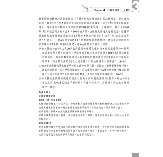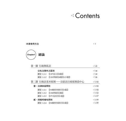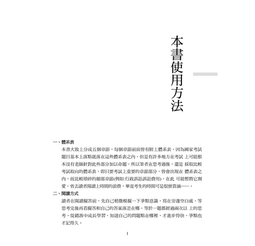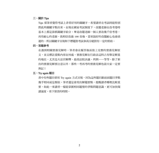 對於第一次拿起本書的讀者,如何選擇問題,筆者簡單說明一下,本書定位是純解題書,就是單純練習題目讓讀者可 以增加安定感,至少考古題出現過的內容要能把握,面對疑似未看過的爭點,也能透過本書各種行政法爭點練習,能寫出可以說服改題者,進而取分的內容。最後,辛苦的大家在準備考試之餘,記得還是要撥空讓自己能放鬆一下,希望大家都能達到自己所設定的目標!加油!