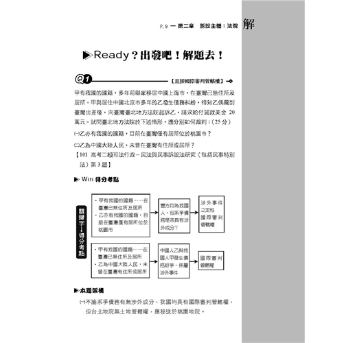 本書藉由「得分考點」單元,從題目分析爭點所在,藉此訓練讀者審題能力,並進而提出「本題架構」幫助考生快速理解筆者論述層次,而可以在考試準備時間不夠的時候,快速判斷是否不甚理解各該題目相關論述技巧或見解而要深入閱讀本題;另一方面,也可以讓讀者理解筆者解題的思考脈絡,以供「見賢思齊、見不賢內自省」。最後,在某些題目中,也附上相關申論題、實務見解及衍生專題供讀者進一步檢驗是否概念扎實。