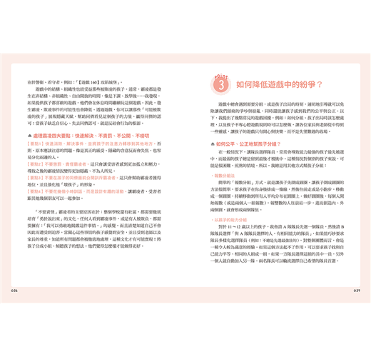 如何公平、公正的幫孩子分組?/孩子在遊戲中出局時,我們該如何引導?/解釋遊戲時,可以用下列方法提升孩子的專注力/結束遊戲時,也是訓練孩子「反思」的時刻