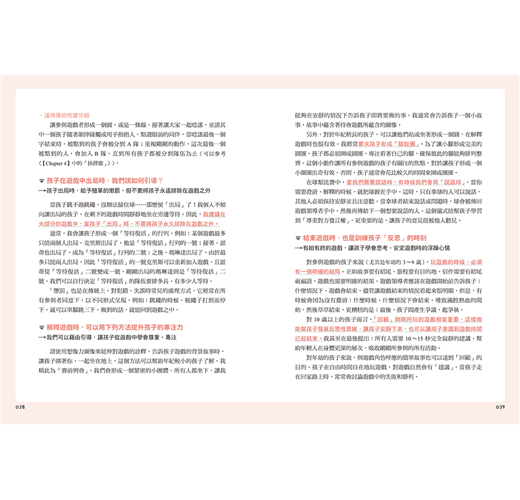 遊戲的過程中,常常會有不同狀況與問題。書中有不同的例子、方法告訴我們「如何幫助孩子」,尤其是那些難以加入遊戲的孩子,可能會透過退出遊戲、干擾、搗蛋來表達自己。這些孩子需要找到創新的方法來遊戲,並以更健康的方式與其他孩子、成人產生連結與互動。