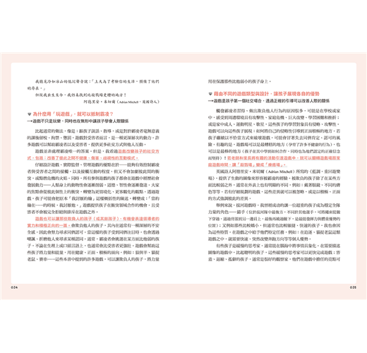 這本書不僅僅在概述「如何規劃兒童遊戲」,同時讓讀者充分了解「搭配特定年齡層的遊戲」,以及「不同的兒童發展階段」。因此,這本書可說是兼具「兒童發展指南」和「實用遊戲書籍」。