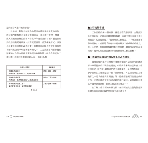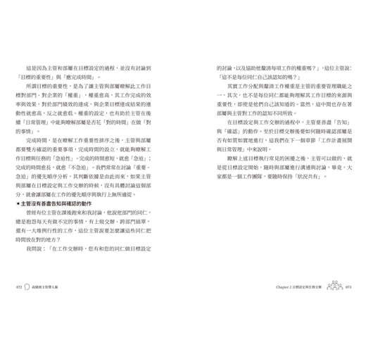 力仁寫這本書真的是佛心來著,他將主管會遇到各種狀況都想到了,並且一一寫進書裡。從上任前的準備,到目標設定、任務交辦、計畫展開、日常管理、問題分析、工作改善,甚至是溝通藝術、部屬培育、團隊領導、績效管理、員工發 展......等等,所有擔任主管職所需要的硬技巧和軟實力都在其中。每一個章節都看得到力仁的用心和他馳騁於職場的影子。書中舉的例子涵蓋公司內各個部門,很容易依場景對照 自身的處境並找到解方。此外,力仁將這些含金量極高的管 理手法與領導心法,以自創「作、夥、動」、「個、位、好」、「情有可援」、「美問避答」的口訣,幫助讀者吸收與記憶,真的好貼心。