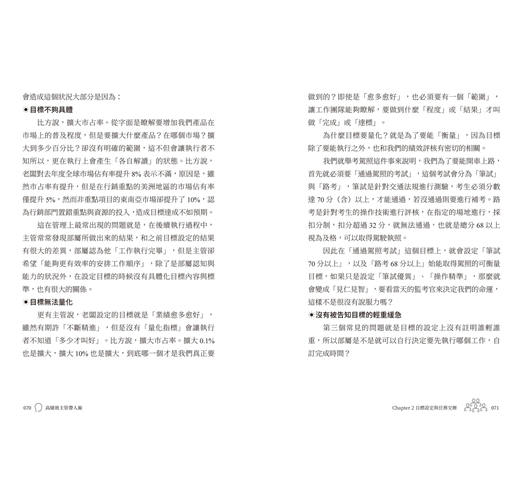 很多新任主管都是因為自己本身績效卓越、堪為表率所以才會被提拔擔任主管。但,自己做得好,帶群也會一樣好嗎 ? 自己可以做到90分,部屬做不到 90分就該被處罰或淘汰嗎 ? 好的主管除了自己也要做好,更重要的是要讓別人也心甘情願地為他效勞,同時教導他讓他也可以跟自己做的一樣或更好。這一方面要靠主管個人的領導特質,另一方面就是管理技術。大仁哥的新書正可以讓所有新上任的主管在最 短時間學到所有管理大師的智慧。本書的編排也非常有邏輯性,他是從新官上任前的心理建設(第一章新官上任前應有的準備)、到團隊建立(第二章目標設定與任務交辦)、然後任務執行(第三章計畫展開與日常管理)、遇到棘手狀況的處理(第四章問題分析與工作改善)、遇到難搞人員的處 理(第五章主管的溝通藝術)、遇到落後或狀況外人員的處理(第六章部屬培育與工作指導)、遇到人心浮動與歧見的處理(第七章團隊領導與共識建立)、最後是功過賞罰的激勵與再出發(第八章績效管理與員工發展),這是一個完整的管理週期,而且幾乎一個主管的日常都涵蓋了。我最喜歡本書的是除了是他可以當做一本工具書,介紹各種可以應用 的管理表格與方法,同時每一章節都透過一個實際的管理情境作為開始,讓你知道這些管理藥方的「適應症」,相信會讓主管更心有戚戚焉。
