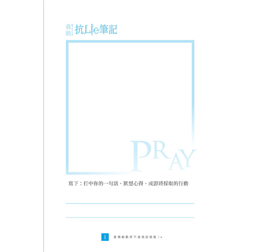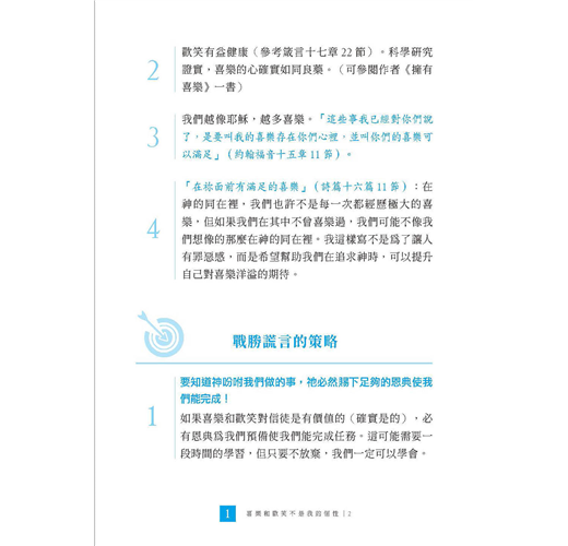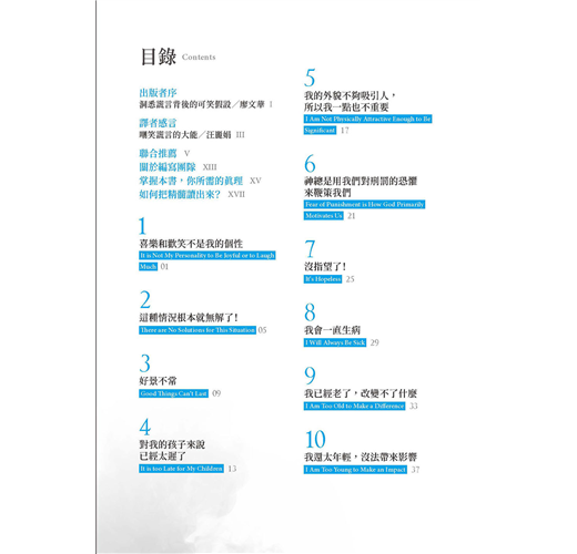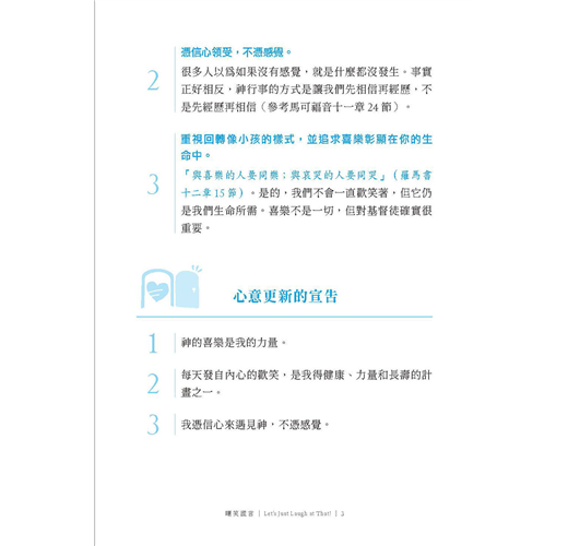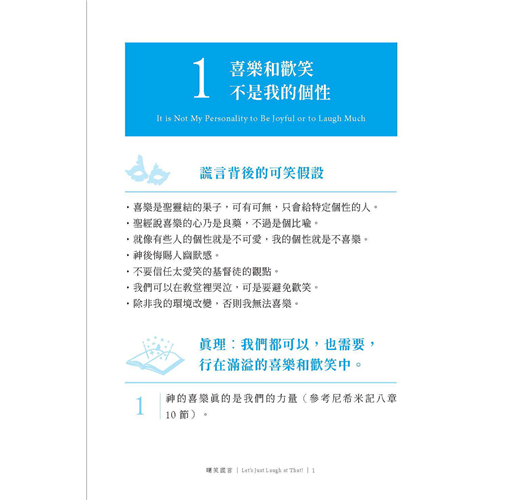 保羅勸勉信徒要藉著心意更新而改變過來,這樣才能在生活中真實地驗證並活出上帝的旨意(參考羅馬書十二章2 節)。攔阻神旨意最大的原因不是魔鬼,是我們的思想。作者在本書中,直接了當地指出一些不合真理的普遍想法,然後又鼓勵我們用嘲笑的方式來轉換思想。嘲笑,是因為真理使我們得了自由;嘲笑,是因為我們看穿了謊言不過是一隻被拴住、只會狂吠的小狗。哈哈哈哈哈,在基督裡我們都是自由的!拿起這本書,好好的笑一笑吧!