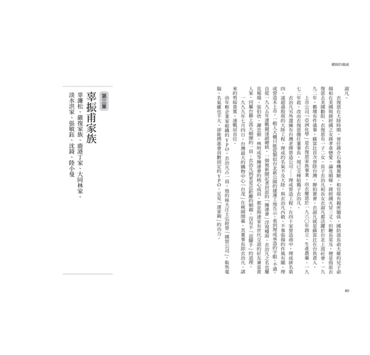 這就是作者所說的,「把台灣半世紀來四位總統結成一家親的,只有二十個家族,而且各個是世家豪門,而其他可牽連到政商姻親大系裡的個人或家族,也絕對沒有半個是寒士平戶。」