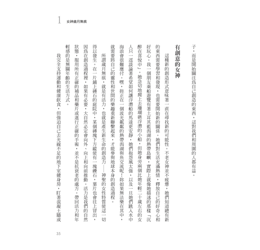 作者是位執業許久、備受愛戴的美國婦產科醫生,在這本書中,她藉由寫更年期的女性為途徑,實則描繪出如何成為精神奕奕、愉悅、真正的女人。