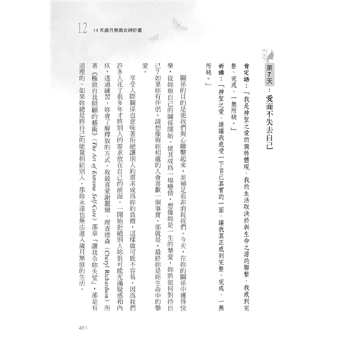 本書最後,作者提供十四天的「歲月無痕女神計畫」,希望讀者能應用書中所寫滋養身心。當妳完成這十四天的自我培訓,歲月無痕的光輝將隨之閃耀!
