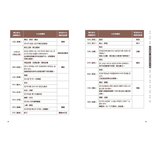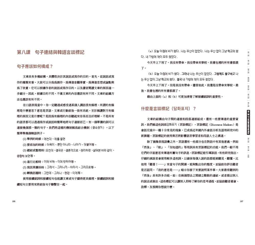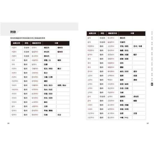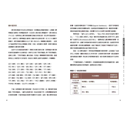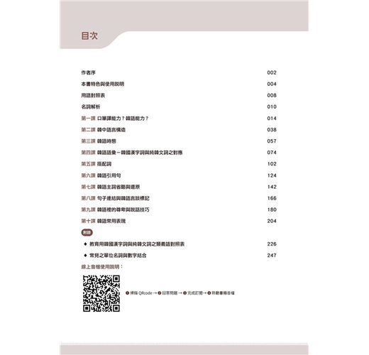 作者序 本書特色與使用說明 用語對照表 名詞解析 第一課 口筆譯能力?韓語能力? 第二課 韓中語言構造 第三課 韓語時態 第四課 韓語語彙-韓國漢字詞與純韓文詞之對應 第五課 搭配詞 第六課 韓語引用句 第七課 韓語主詞省略與還原 第八課 句子連結與韓語言談標記 第九課 韓語裡的尊卑與說話技巧 第十課 韓語常用表現 附錄 -教育用韓國漢字詞與純韓文詞之類義語對照表 -常見之單位名詞與數字結合