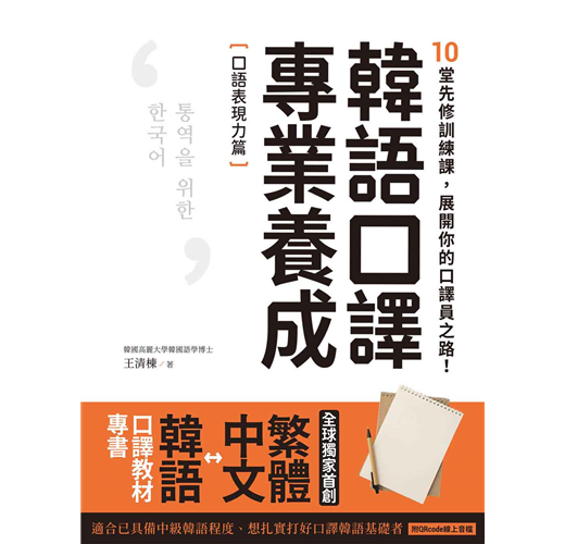 《韓語口譯專業養成》為王清棟教授根據多年教學經驗與實證,針對中韓口譯課程所設計的一套系列教材。首本為「口語表現力篇」,規劃了10堂學習口譯之前的先修課程,帶領讀者從韓語詞彙、句子到說話表現,逐步打好口譯的韓語基礎,在日後進行口譯或商業場合中,能更扎實且熟練地發揮實力。