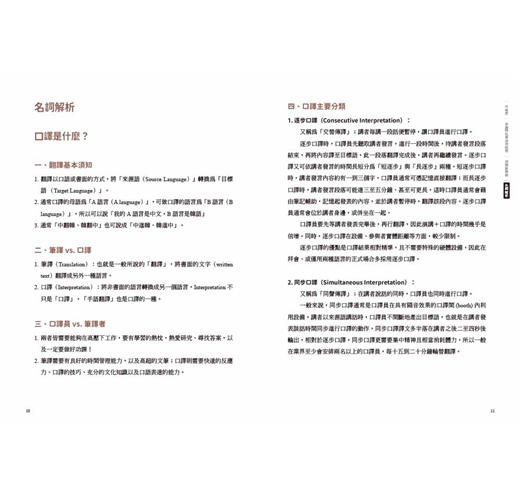 進行口譯時,需要注意許多語言轉換的細節與韓語的特色,才能翻出良好譯文。此時,韓語的基礎功就格外重要,本書從詞彙及語句切入,整理出翻譯需要注意的特點,例如漢字詞與純韓文詞的轉換、韓語數值唸法、搭配詞、時態、引用等,雖然看似基本,但這些都能讓你更扎實打好口譯基礎。