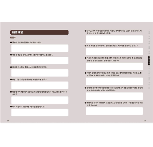 每堂課的最後都有實作練習,例如中翻韓、韓翻中、韓中語言構造對應練習等,並會適時搭配音檔。透過練習題,不僅能培養翻譯語感,還能增強實力!