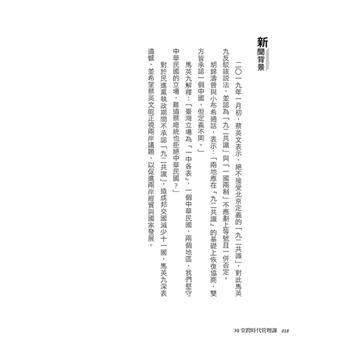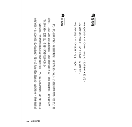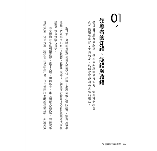 2.收錄30篇文章,每篇文章即為1堂管理課,除了基本義理闡述,更佐以「新聞背景」、「典故出處」與「決策意涵」等單元,有益閱讀者融會貫通、多面向思考。
