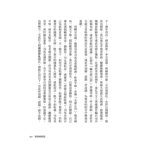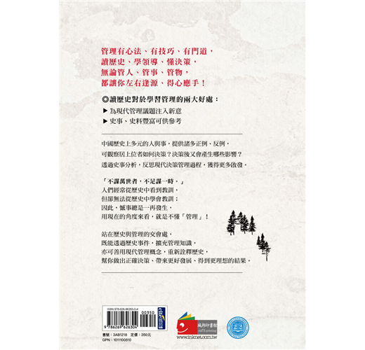 1.從「領導風格」、「決策視野」、「制度」與「變革」四大面向切入,以豐富的中國史素材探討現代管理議題,借鑑古人智慧,幫助今人養成長視野心靈。
