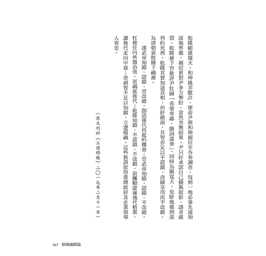 漢武帝知錯、認錯、肯改錯,創造後代再起的機會;晉武帝知錯、認錯、不改錯,枉費任內些微治效,更禍延後代;乾隆知錯、不認錯、不改錯,浪擲順康雍幾代積累,讓後代走向中衰;崇禎智不足以知錯,立遭橫禍。這些教訓值得臺灣政府及企業領導人省思。