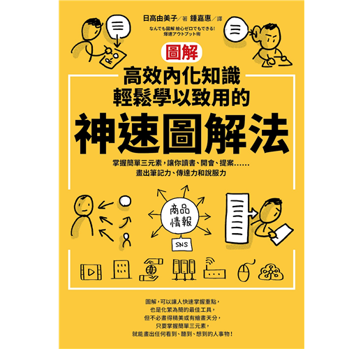「神速圖解法」能化繁為簡、以淺白的方式表現深奧的內容,激發更多的討論,是影響下一步行動的產出術。會面商討、開會、腦力激盪、簡報,在所有場合都能發揮很大的功效。