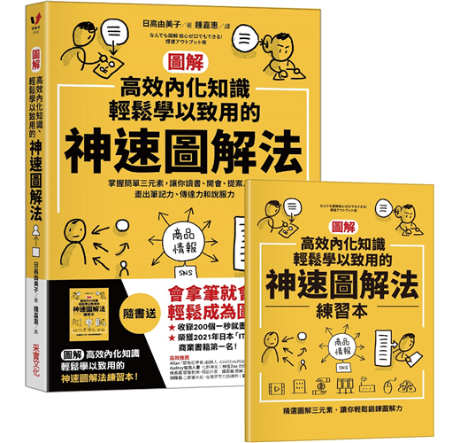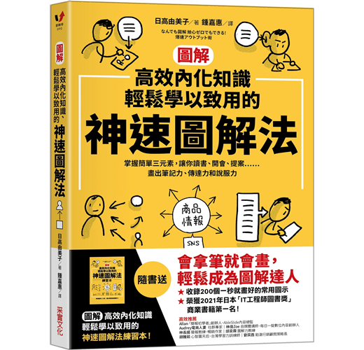 如果你想感受圖解的好處,誠摯推薦你好好閱讀這本《【圖解】高效內化知識、輕鬆學以致用的神速圖解法》,作者會一步步帶領你,用基本圖型畫出好懂的圖解,並附上許多案例與圖形示範,讓你從無到有培養出圖解溝通能力,在任何場合都無往不利。