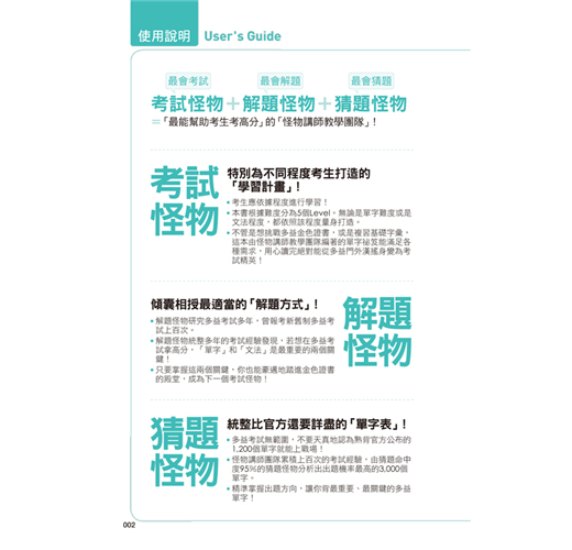 多益考試無範圍,不要天真地認為熟背官方公布的1,200個單字就能上戰場!怪物講師團隊累積上百次的考試經驗,由猜題命中度95%的猜題怪物分析出出題機率最高的3,000個單字,精準掌握出題方向,讓你背最重要、最關鍵的多益單字!