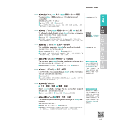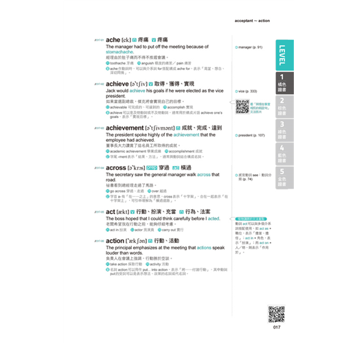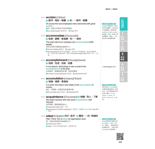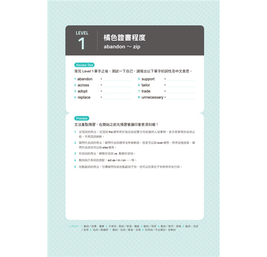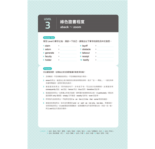 全書內容按照證書程度劃分,且為了讓強化學習效率,本書採取創左欄單字、右欄文法重點的編排方式,根據每個 Level的能力,安排最適合該階段學習者程度的文法,單字配合文法一起學,更有效率!