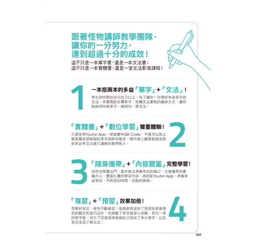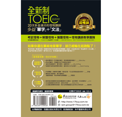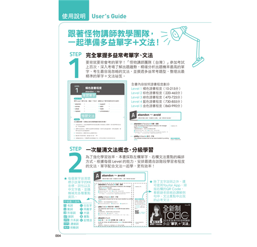 要背就要背會考的單字!「怪物講師團隊(台灣)」參加考試上百次,深入考場了解出題趨勢,精確分析出題機率最高的單字、考生最容易忽略的文法,並摸透多益常考題型,整理出最精準的單字+文法祕笈。