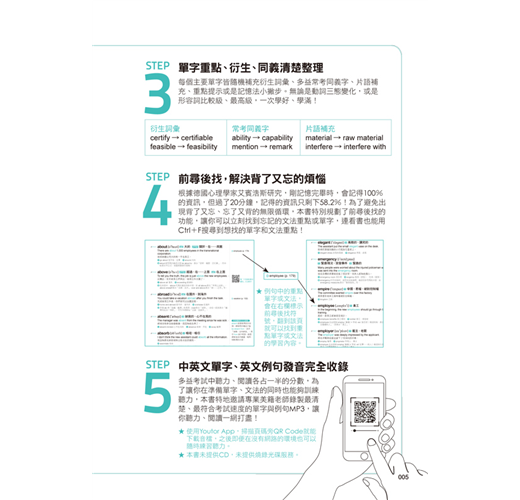 根據德國心理學家艾賓浩斯研究,剛記憶完畢時,會記得100%的資訊,但過了20分鐘,記得的資訊只剩下58.2%!為了避免出現背了又忘、忘了又背的無限循環,本書特別規劃了前尋後找的功能,讓你可以立刻找到忘記的文法重點或單字,連看書也能用Ctrl + F搜尋到想找的單字和文法重點!