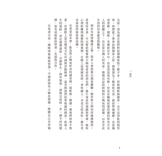 這是一個特別且值得認識,但我們還不熟悉、很多人好奇的國家。立陶宛跟台灣的緣份才剛開始,期許這本書成為串起兩地的橋樑,提供無論只是想要開展國際視野、了解這個國家,還是打算前往旅遊、求學、從事各種交流與合作的讀者,對立陶宛有更多認識,大幅縮短學習曲線與適應歷程,更快、更容易地開展更多收穫。