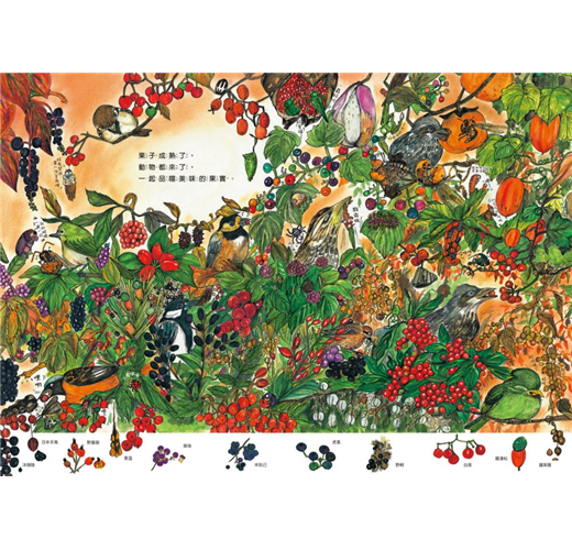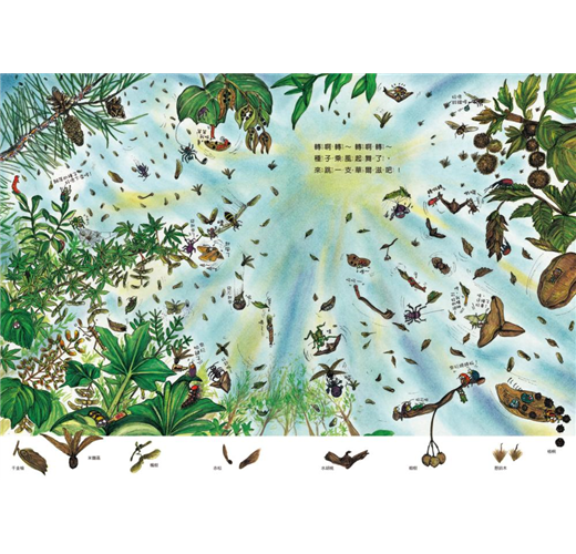 每一頁看似簡單,實則藏了許許多多的小細節。不同傳播類型的種子,與不同棲息地的昆蟲或小動物搭配,相映成趣,甚至連季節變化,都透過顏色與動植物的物候一一呈現。