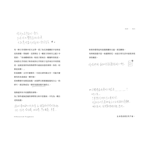 特別保留不朽書寫時留下的手寫眉批,畫線、筆記、雜感、塗鴉,提出問題的不朽、回答問題的不朽、重讀問題的不朽於書中交會,讓往復的碎片拼湊出生活的全貌。