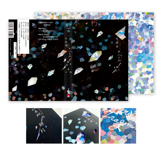 這些碎片象徵不朽生活的集合,挖洞書衣覆蓋其上,即成為具有多樣切面的寶石。書衣燙上雷射膜碎片,翻轉書本角度的同時能感受到光芒的變化。