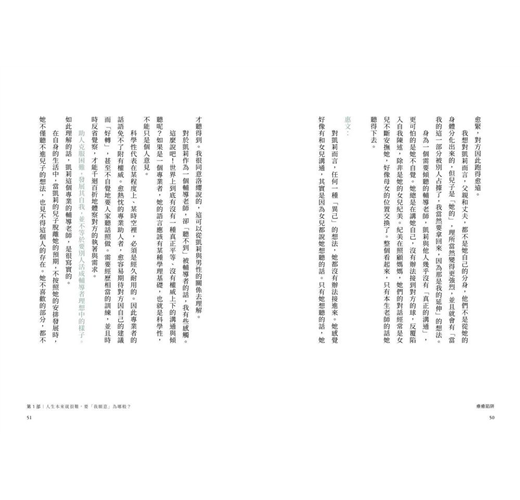 作者與心理專家的對話,讓我們可以深入理解每個人到底匱乏了什麼,理解他們的焦慮與孤寂感……若更明白人的心理機制,或許能避免自己陷入類似的狀況,也能以此同理,幫助身邊有類似困擾的人。──張國洋/大人學共同創辦人