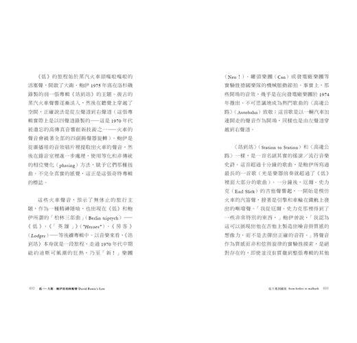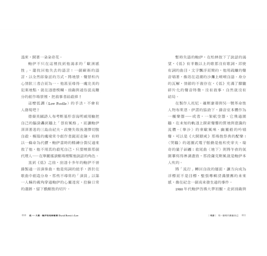 透過本書,我們能從中看到大衛.鮑伊在自律/自毀之中的擺盪,在創作上的有所為與有所不為,以及那種在飽受壓力(包括離婚官司、精神狀態不穩定等等)的掙扎之下,冷冽疏離又內省低調的電子聲響背後的炙熱靈魂。——楊久穎(譯者、文字工作者)