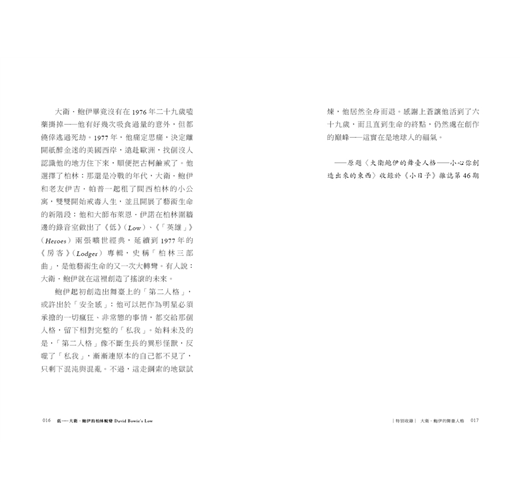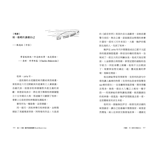 千萬不要以為這本書只是綜合維基百科或Google查得到的「大衛.鮑伊」生平事蹟和樂評資訊,這樣其實不夠硬派,也滿足不了狂愛他的樂迷。本書聚焦從一張經典專輯切入,重探每首歌的創作脈絡、合作互動乃至錄音細節,彷彿要把讀者偷渡至那些靈感飛馳的神祕現場、甚至是鮑伊自我重整的身心歷程。由此獨特路徑,重新理解這位偉大藝術家,翻開的每一頁都是玄妙宇宙風景;重聽的每個音符,也有了不同維度持續迴盪的聲響。——李明璁(社會學家、作家)