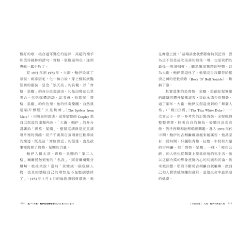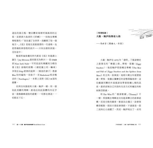 大衛.鮑伊是通往外星世界的指路人,是讓所有怪胎感到不孤單的英雄,不斷自我創造的神祕之獸,是二十世紀到我們這時代流行文化最具顛覆秀的創造者。——張鐵志(搖滾作家,著有《未來還沒被書寫:搖滾樂及其所創造的》)