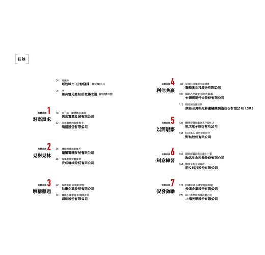 桃園一直是全國產業重要聚落,鮭魚返鄉的臺商近幾年也陸續加入陣容, 目前桃園地區擁有 34 個報編工業區,眾多業者選擇在桃園設廠,包含電 子、機械、資通、生醫、傳產、物流及服務業等種類,規模從上市公司、 中小企業到新創團隊都有,其中不乏存在擁有核心技術、全球市占率高的 隱形冠軍。本書特別收錄了 15 家於桃園落地生根的企業,其累積多年的 實戰智慧,在風起雲湧的商場上如何站穩腳步、克敵制勝,並帶領產業登 上世界舞臺。即使疫情擾局,面臨難以預測的眾多挑戰,這 15 家企業依 舊能憑藉多年累積的實力與智慧,淬煉多年的技術應用,乘勢而起深化產 線與顧客間的穩固關係,透過經營者卓絕的眼界,為企業做足準備,全面 展現連結力、穿越力與開創力,以增強企業韌性。不僅如此,這些桃園在 地企業更具環境永續的前瞻性,在營收屢創新高的同時,積極進行產業能 源升級與轉型行動,兼顧綠色永續的願景、落實循環經濟,善盡企業社會 責任。