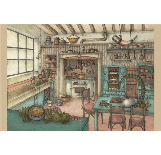 廚房餐桌上擺著打敗巨人的「傑克魔豆」和使白雪公主沉睡的「毒蘋果」;