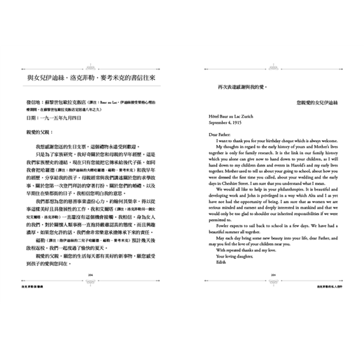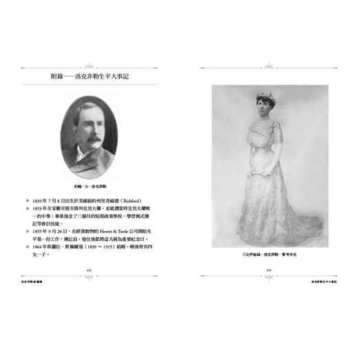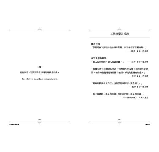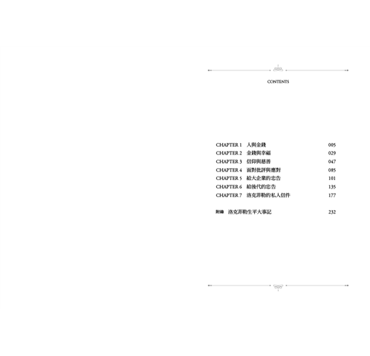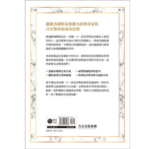 書中還包含約翰.D.洛克菲勒面對財富滿溢時,如何以最睿智且最謹慎的方式分配,並與社會共享財富的想法。最後,我們還得以透過洛克菲勒一些與兒子、女兒之間最私密的信件,來了解他的生活與思維。這些經典名言和私人書信教導我們: