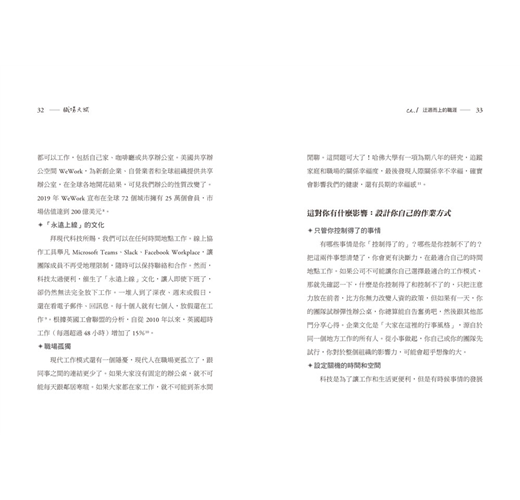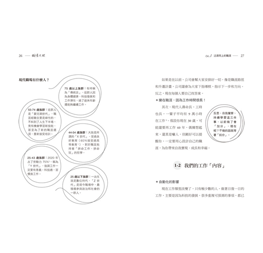 其次,現代人壽命長,工時也長,一輩子平均有9萬小時在工作。假設你現在30歲,可能還要再工作40年,偶爾想起來,還真是嚇人,但剛好可以提醒你,一定要用心設計自己的職涯,為你帶來自我實現、成長和幸福。