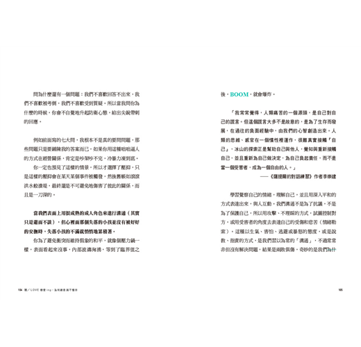 學習覺察自己的情緒,理解自己,並且用深入平和的方式表達出來,與人互動。我們溝通不是為了抗議,不是為了保護自己,所以用攻擊、不理睬的方式,試圖控制對方,或用受害者的角度去表達自己的受傷和悲苦(情緒勒索)。這種以生氣、害怕、逃避或暴怒的態度,或是說教、指責的方式,是我們習以為常的「溝通」,不過常常非但沒有解決問題,結果是兩敗俱傷,奇妙的是我們為什麼怎麼會仍然慣性地重複這樣的互動呢?
