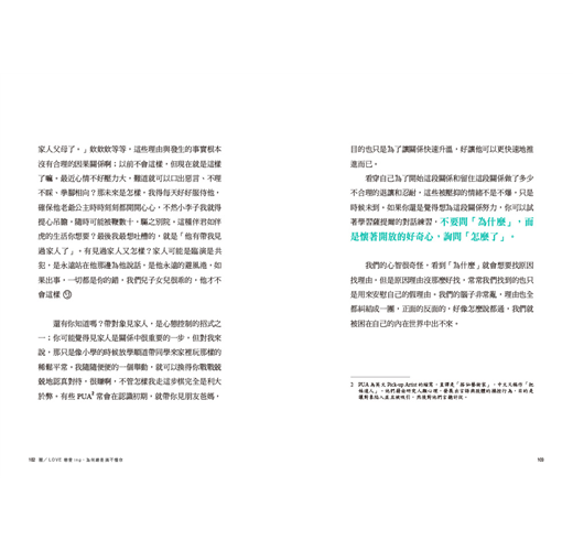 還有你知道嗎?帶對象見家人,是心態控制的招式之一;你可能覺得見家人是關係中很重要的一步,但對我來說,那只是像小學的時候放學順道帶同學來家裡玩那樣的稀鬆平常。我隨隨便便的一個舉動,就可以換得你戰戰兢兢地認真對待,很賺啊,不管怎樣我走這步棋完全是利大於弊。有些PUA2常會在認識初期,就帶你見朋友爸媽,目的也只是為了讓關係快速升溫,好讓他可以更快速地推進而已。