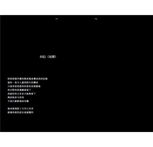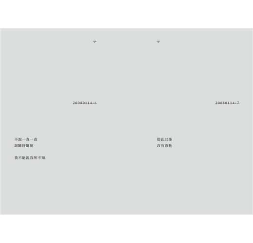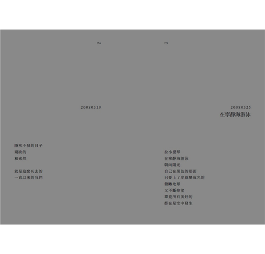 當天夜裡,因為受到後來談話的影響,一直睡不著覺,許多思考開始不斷出現在我腦子裡,我開著電腦,只有電腦螢幕的亮光,我把它們一個一個打下來。連續三天,我都在早上入睡。自那天以後,我就進入一種很特殊的狀態。一天兩首、三首、五首,然後二十首。我開始察覺我的寫作已經不需要依賴靈感了,或者,其實是我隨時隨地都處於靈感狀態。我開始對空氣和天空的光線特別敏感,我能察覺在我周遭所有隱藏的情緒,我彷彿看見了這個世界更多的事物,它們像是正片負沖的照片,對比鮮明,色彩強烈。我的眼睛和五感都變成新的。我想起了禪宗,想起了開悟。我感覺我彷彿終於能夠理解他們了。甚至當我看見一個人,我似乎可以知道他心裡正在想些什麼。魏晉人說「得象而忘言」、「得意而忘象」;我開始思考我是不是可以就此不寫了,我認為我或許已經達到目的,可以捨棄方法了。