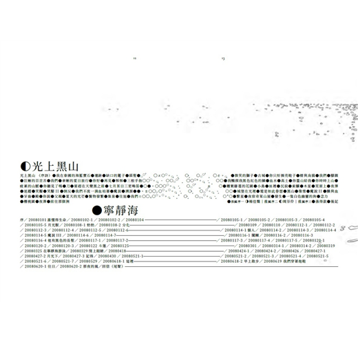 從書名看,「光」、「山」、「海」,巨大、必要且對照,「黑」、「寧靜」也許是實況與願望,這些字眼交織出一個廣袤世界,也傳遞肅穆、帶宗教感的美。「光上黑山」是個過程,配色類似羅智成「黑色鑲金」,然而前者帶著探索之意,後者則近於景觀。