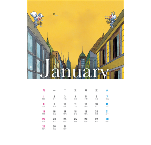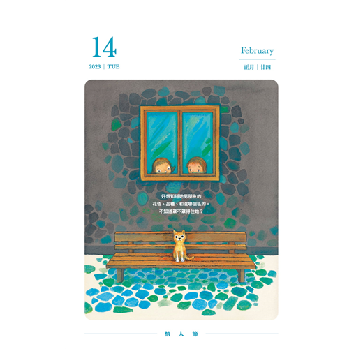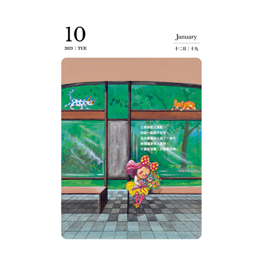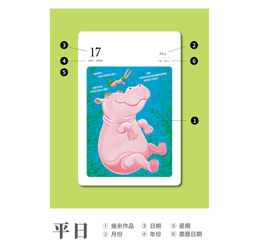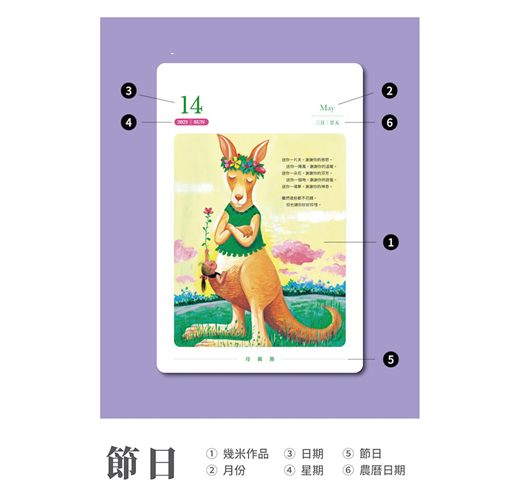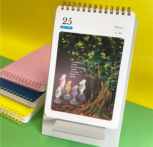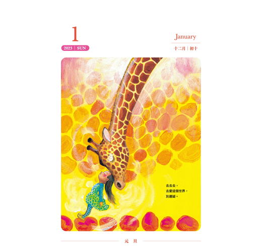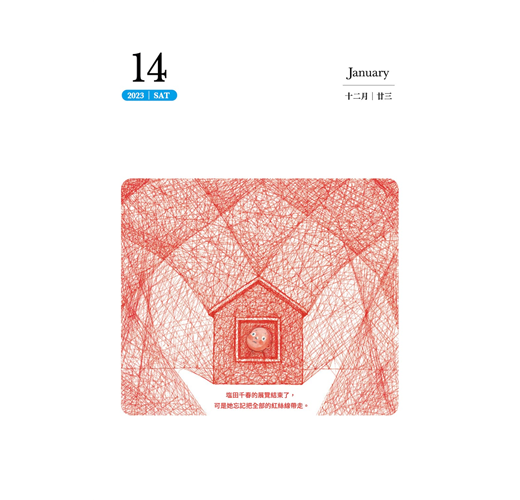 為了讓大家可以好好保存年曆的每一頁,同時具有實用性,《幾米年曆2023》採取線圈裝訂,可將每張日曆往後翻,不必撕下也不必煩惱撕下的日曆如何收藏。也特別將全年的日曆分成四冊裝訂,便於輕巧地陳列於所附的腳架上。每張日曆背後印有筆記格線,除了日曆之外也可以當作幾米筆記本。