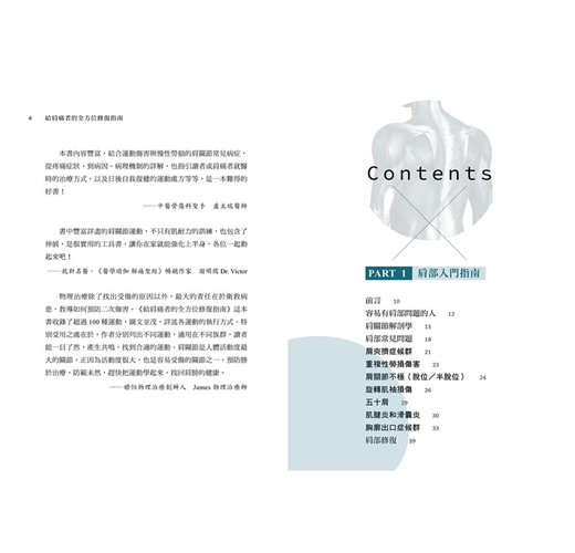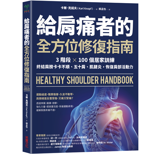 「此書針對肩部疼痛相關疾病的發生原因進行了深入淺出的解說,並依照不同的情況給予適當的復健訓練方式,對於有肩膀疼痛問題的人來說,是一本非常實用的書籍。」──超越復健診所副院長 凃俐雯醫師