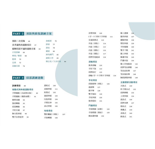 ˙12種易造成肩傷的情況:針對游泳、打球、久坐不動等會造成肩部危害的情境,提供一套訓練方法,不僅可預防傷害,還能維持肩部良好功能。