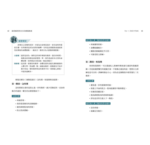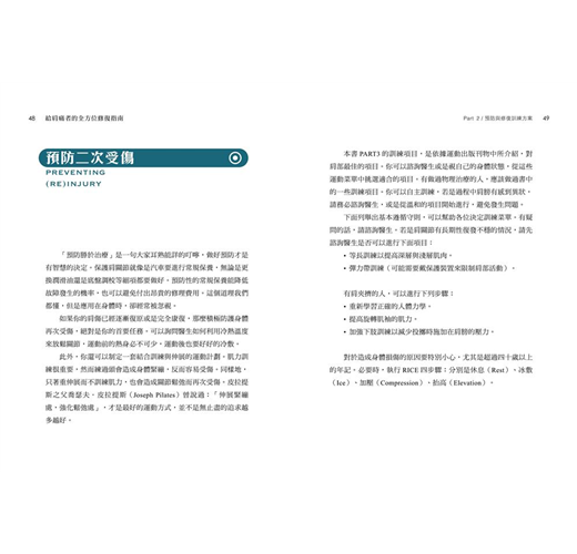 本書是一本專業參考書籍,內容強調預防與修復。常見病因、症狀、復健方式,對於二次勞損傷害更提供方法與加強防禦,讓你能即時判斷傷害。不管新手或老手在運動過程中受傷在所難免,何時需要就醫、何時可以自癒,本書也都提供淺顯易懂的指引。」──烈哥的舉重教室 邱一烈