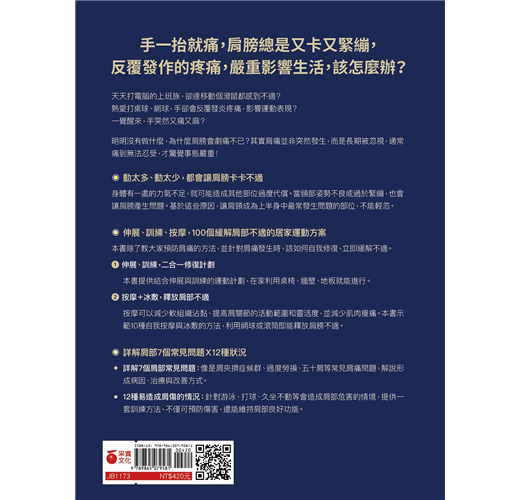◎ 伸展、訓練、按摩,100個緩解肩部不適的居家運動方案本書除了教大家預防肩痛的方法,並針對肩痛發生時,該如何自我修復,立即緩解不適。