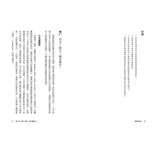 除此之外,我們把一些最新研究的重點整理為「補充材料」,按照它們所在章節的位置,以小標註明提供參考。舉例來說,第二章第一個補充材料會寫成:「補2.1:先天?後天?兩者都有!」補充材料的內容放在每一章的結尾,供對精神病態感興趣的學生來研究,而其他人則可以直接跳到下一章。我們也提供了「討論問題」,來激發讀者思考材料的要點;這些問題也適合課堂使用、或讀書會討論。註釋的部分提供正文討論內容的參考資料,按照各章順序安排。關於精神病態的紀錄片數量繁多。我們在「推薦紀錄片」中,列出一些較好的作品。讀者也可在www.hare.org尋找關於精神病態的書籍、章節、文章的最新清單。其中許多可以在網路上直接連結到文章的摘要。「精神病態科學研究學會」的網頁(SSSP;www.psychopathysociety.org)以及「精神病態倖存者基金會」(www.aftermath-surviving-psychology.org),也各自提供了關於精神病態研究,以及存活技巧的重要資訊。