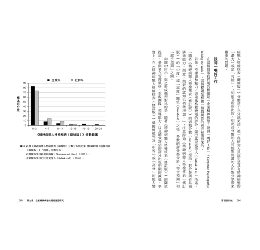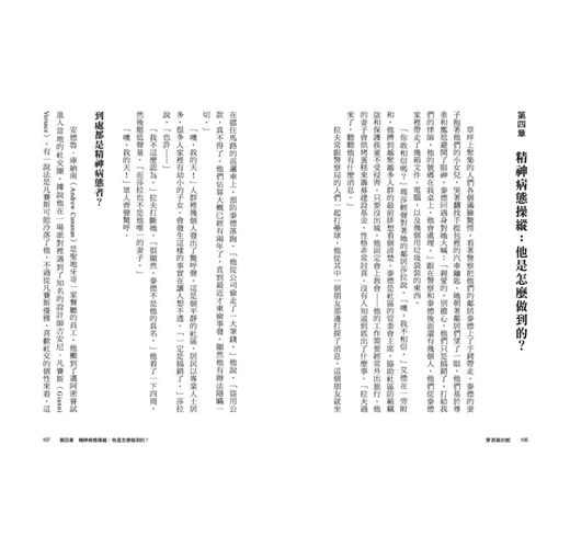 不過還有一種人,他們的行為與態度對公司和員工、對政府和公民,潛藏著更大的破壞性。本書的主題要談的就是這類人,他們深沉、黑暗的人格,建立在說謊、操弄、欺瞞、自我中心、冷酷無情、以及其他毀滅性的特質。這種人格被稱為「精神病態」或「心理變態」(psychopathy)。