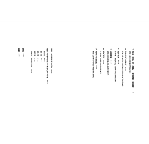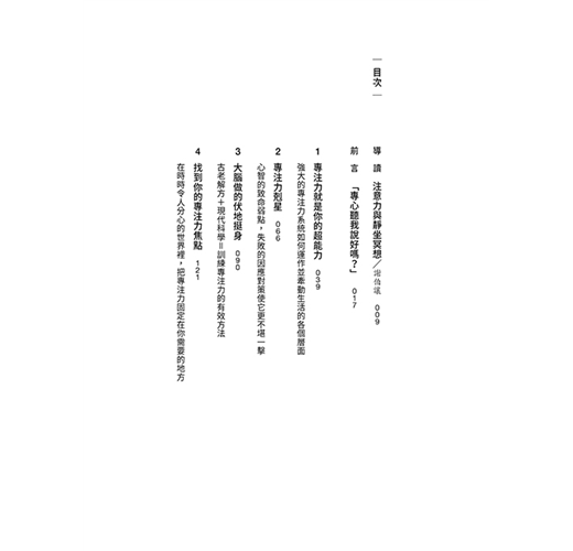 在這本書裡,作者提供我們一個寶貴的練習指南,教讀者用正念覺察訓練專注力,將人類潛能發揮到極致。你會從中學到正念訓練背後的科學根據,以及面對壓力也能提高韌性,加強專注力、創造力、心智力量和避免心智被蒙蔽的方法,而且是經過透徹研究的方法。